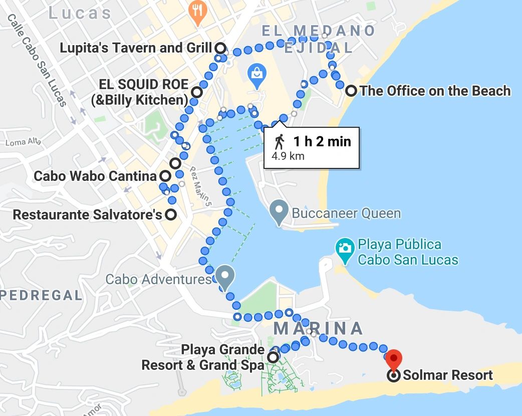 The above map has several of Cabo's "Greatest Hits" marked. It gives you a good idea of the general layout and shows you how walkable the area is. Spend a minute with it to orient yourself. See below for some links to my top recommendations. There are a LOT of good restaurants all around the marina too. They'll be more pricey, but some of the bars are casual and more affordable but still lovely to sit by the bay. Just wander! And ask around. You're often able to catch live music or a good happy hour, and for about $5.00 or so you can catch a water taxi to the other side of the harbor. Uber is readily available too -- keep in mind it can be HOT here so a $5.00 ride in air-conditioning will be appreciated!